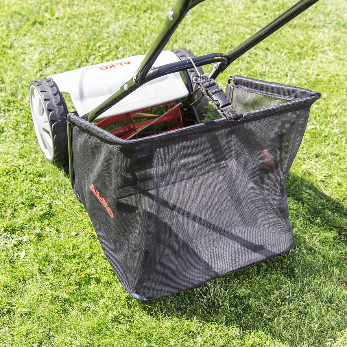 - Strong grass catcher made of fabric with metal frame.