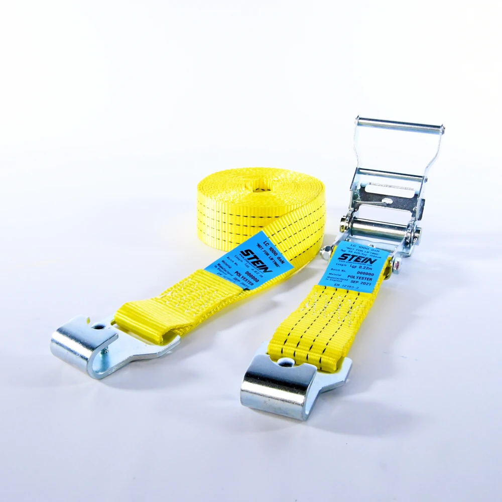 Supplied with a specially designed ratchet strap fitted with Carbon Steel hooks with Keeper Pins to prevent the mounting hooks from detaching from the device when not under tension. The webbing is made from a high tenacity 50mm wide polyester yarn and is UV resistant with a 6000kg breaking strength.